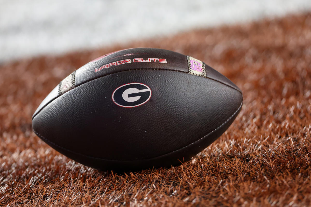 AUSTIN, TX - OCTOBER 19: A Vapor Elite football with the Georgia logo on it sits on the field during the SEC college football game between Texas Longhorns and Georgia Bulldogs on October 19, 2024, at Darrell K Royal - Texas Memorial Stadium in Austin, TX. (Photo by David Buono/Icon Sportswire via Getty Images)
