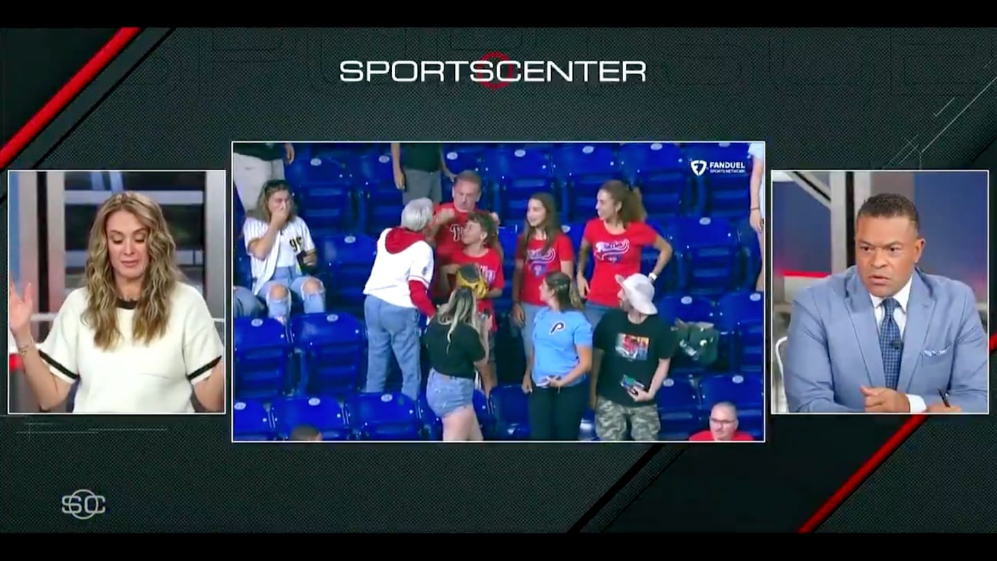 The Phillies fan who ultimately left with the ball came under fire from fans across the internet, and also left SportsCenter anchors Nicole Briscoe and Michael Eaves in disbelief as they recapped the interaction.