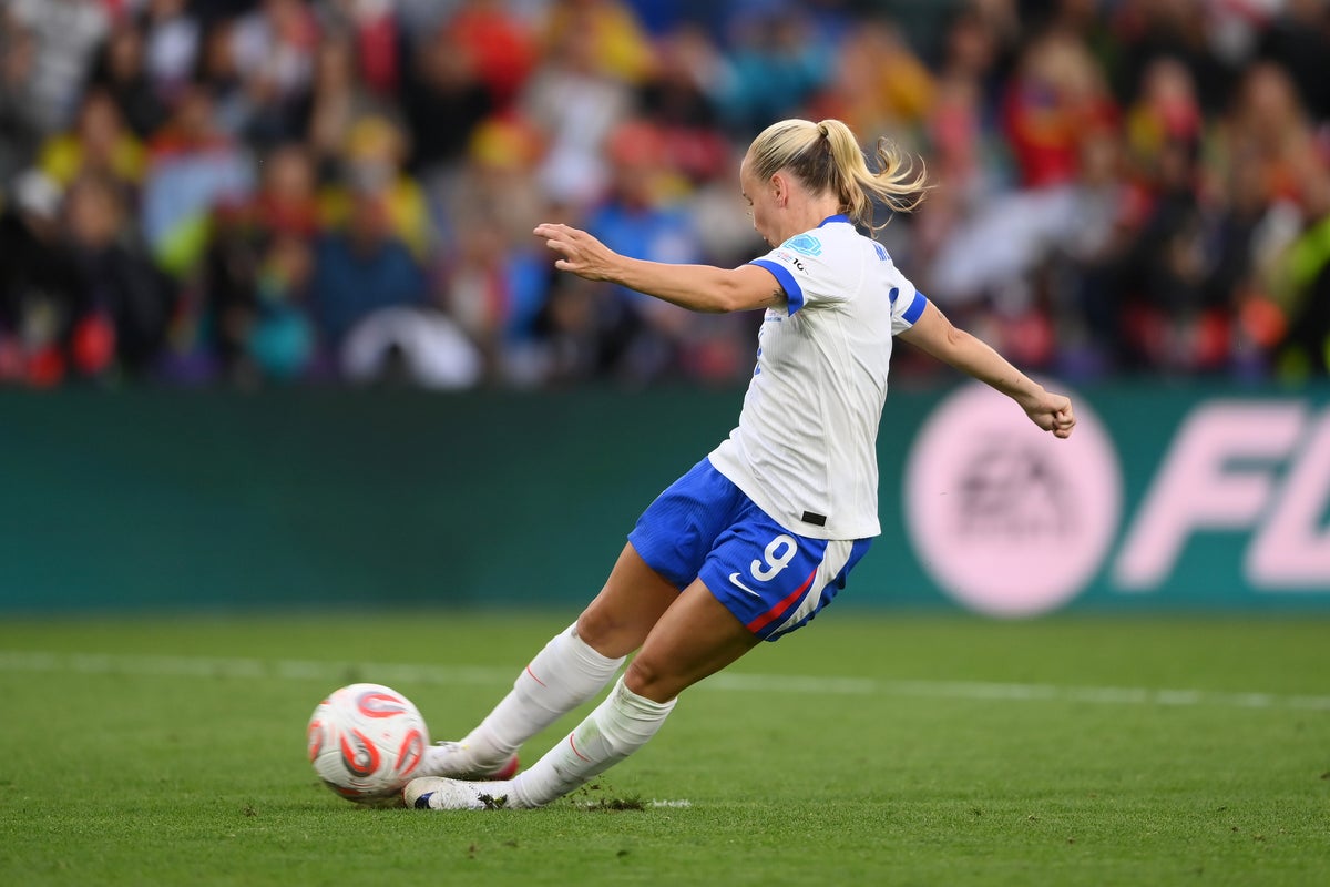 The second-half substitute was nominated as England’s first penalty taker, and duly fired the ball down the middle of Spain goalkeeper Catalina Coll’s goal. But Mead had clearly kicked the ball twice, hitting it against her standing foot as her boot slipped on the grass, and replays confirmed what referee Stephanie Frappart suspected.